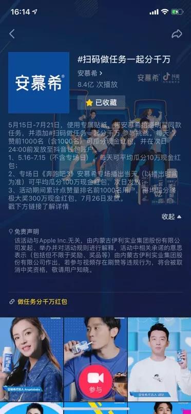 5月15日-7月21日,打開抖音掃描【安慕希x抖音】新包裝二維碼,完成指定任務并在當天24:00前按要求在抖音平臺上傳任務視頻。點贊排名前1000名(包括第1000名)即可瓜分現金紅包。本次傳播巧妙的以產品為開頭,將傳播的核心基于產品,讓線下購買行為反饋到線上UGC內容,互動內容同時與品牌產生聯名款產品進行閉環式的營銷。