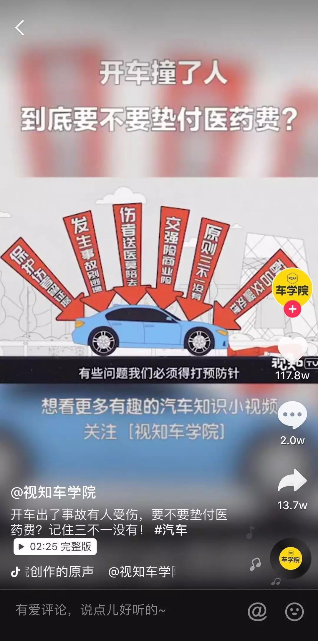 「視知車學院」曾一周漲粉62.3萬,分享的知識相對更加冷門,例如,一輛車的加速能力好不好,該看功率還是扭矩?開車撞了人,要不要墊付醫藥費?